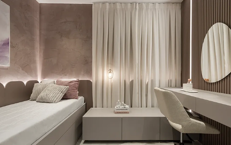 Nos quartos, a transformação também é visível. Guarda-roupas embutidos, camas com gavetas e mesas de cabeceira integradas ajudam a otimizar o espaço, enquanto papéis de parede com cores ou texturas suaves criam um clima aconchegante e personalizado. Essa combinação deixa o ambiente bonito e confortável, sem abrir mão da praticidade.