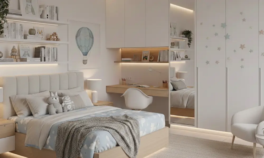 No dormitório de menina planejado, cores suaves, iluminação bem distribuída e nichos decorativos ajudam a criar um ambiente funcional e organizado, sem abrir mão da personalidade. A inclusão de espaços para estudo, armazenamento e autocuidado deve ser pensada de forma integrada, permitindo que o quarto acompanhe mudanças de rotina ao longo do tempo sem comprometer conforto ou fluidez.